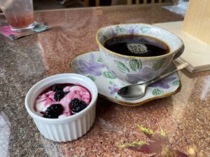 デザートの桑の実のジャムがかかったヨーグルトと、
