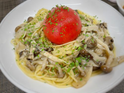 丸ごとトマトとキノコのオイルパスタ。