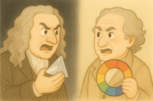 白い光がプリズムで分かれ、虹のように7色に見える仕組み。その背景には、音階との対応や、宇宙の調和を信じたニュートンの哲学がありました。