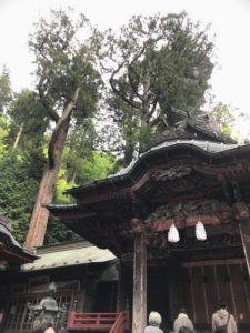本殿の真上にそびえる御神木の杉の木が