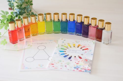 「Step1.TCカラーセラピスト講座」は、カラーセラピーのはじめの一歩。14本のカラーボトルと親切なマニュアル付きで、誰でも5時間で資格を取得し、日常や仕事に活かせます。